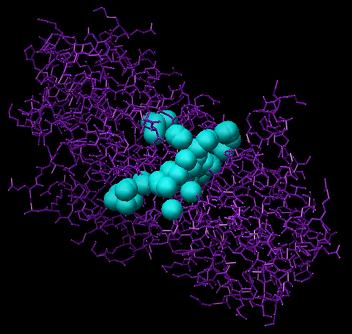 Here, we select all spheres within 10.0 Angstroms root mean square deviation (RMSD) from every atom of the crystal structure of the ligand, using the command "sphere_selector rec.sph lig_charged.mol2 10.0". These spheres can be visualized using the showsphere program, mentioned in OPTION 1, with the command "showsphere < selected_spheres.in". Below is a picture of the selected spheres (blue) (selected_spheres.pdb):