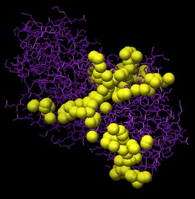 rec.sph #sphere cluster file 1 #cluster number to process (<0 = all) N #generate surface as well as pdb file selected_cluster.pdb #name for output fileTo convert the selected sphere file to pdb format, use the command "showsphere < sphgen_cluster.in" A picture of the largest cluster for the example in this tutorial can be seen below, where the protein is shown in purple and the spheres are shown in yellow (sphgen_cluster.pdb):